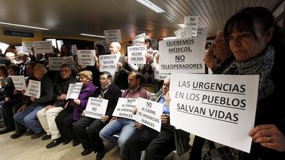 Los vecinos de Tembleque (Toledo) han protagonizado encierros, desalojos y multitudinarias manifestaciones, la última esta misma tarde, en un intento de que el centro de salud de su municipio no echara el cierre a las ocho y hasta el día siguiente. La mayoría de los 150 habitantes de Hiendelaencina (Guadalajara) permanecieron en el PAC del pueblo con el mismo propósito hasta que a primera hora de la tarde les desalojó la Guardia Civil. Su alcalde, Mariano Escribano (PSOE), se encerró en el edificio de la Delegación de la Junta de Comunidades en Guadalajara para conseguir que el Consejero de Sanidad, José Ignacio Echániz, se comprometa a recibir a los ediles de las poblaciones afectadas. “Estoy indignado. Nos mandan a 40 kilómetros en dirección contraria al hospital”, se quejaba el edil a este periódico. Escribano, junto con otros tres alcaldes de la provincia que le acompañaban, abandonó el edificio sin esa promesa. “Nos han dicho que la decisión estaba tomada y era inamovible. Pero Contraviene la legalidad que estipula que un ciudadano tiene que tener un servicio de urgencias a menos de media hora”, declaraba enfadada Juana Jiménez, alcaldesa de Abobes, cuyos habitantes ahora tendrán que viajar más de 50 kilómetros hasta su nuevo PAC en Molina de Aragón.