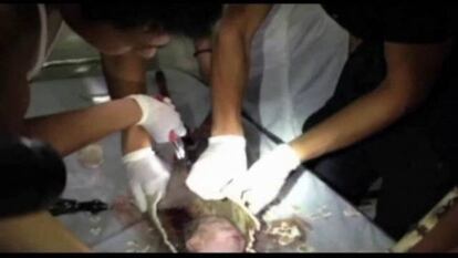 El pequeño fue liberado dos horas más tarde, después de que fuera trasladado al hospital aún enganchado en la sección de tubería, de 10 centímetros de diámetro. Los bomberos y los médicos rompieron el tubo trozo a trozo para extraer al pequeño, de 2,8 kilos y que aún estaba unido a la placenta. En la operación sufrió algunos cortes y arañazos en la cara y las extremidades.