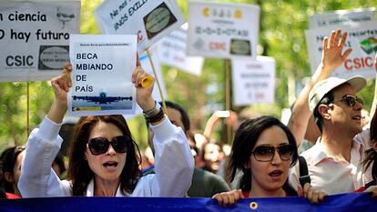 Sergio López llevaba un pequeño cartel reivindicativo: “¿Recortas por ignorante o por incompetente?”. A sus 25 años, está haciendo la tesis doctoral en el departamento de bioquímica de la Facultad de Veterinaria sin beca y sin contrato, trabajando gratis. “¡Voy a intentar irme a Europa, si puedo, y si no, buscaré trabajo en McDonald's o donde caiga, aquí no tenemos futuro gracias a nuestros queridos políticos!”, comentó, mientras marchaba camino del ministerio. A pocos metros de él iba José Vicente García Ramos, exvicepresidente del CSIC y profesor de investigación en física molecular. “Estos no son los primeros recortes, pero es que ahora, encima, el ministerio no sabe/no contesta, y si contesta el para decir una trola. No se puede dejar a la gente como se la está dejando”, se quejaba.