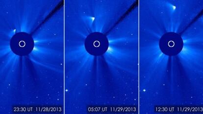 El cometa Ison, que ha mantenido la atención en todo el mundo por su incierto destino al aproximarse al Sol, sigue dando sorpresas a los científicos. El telescopio solar espacial SDO, con el que la NASA observó ayer el paso del cometa casi rozando la estrella, no vio ni rastro del objeto emergiendo tras el sobrevuelo y la NASA lo dio por “roto y evaporado”. Sin embargo, en las imágenes posteriores tomadas con otro telescopio espacial, el SOHO (de la NASA y la Agencia Europea del Espacio, ESA), se apreció una leve mancha en la zona precisamente por donde se esperaba que emergiera el Ison si hubiera sobrevivido.