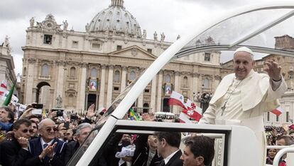 El Pontífice preside en la plaza de San Pedro la canonización de Karol Wojtila y Angelo Giuseppe Roncalli ante 800.000 personas Bergoglio loa la figura de los dos nuevos santos: "Conocieron las tragedias del siglo XX, pero no se abrumaron"