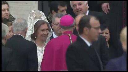 Los reyes de España siguieron la ceremonia en primera fila, a la derecha del altar. La noche anterior, durante una cena en la embajada española ante la Santa Sede, el rey Juan Carlos resaltó la relación de los nuevos santos con España. De Juan XXIII dijo que siempre estuvo “atento a los signos de los tiempos” y que calificó a España como “una sonrisa de Dios”. De Juan Pablo II recordó sus numerosas visitas. También se refirió al papa Francisco, de quien dijo: “Ha dado muestras de sensibilidad social, de cercanía con los más desfavorecidos y de conocimiento de la realidad internacional. Estoy seguro de que su condición iberoamericana ayudará a fortalecer, aún más, el sentido de universalidad que define a todos los obispos de Roma”.
