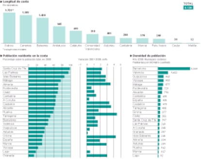 Más de 4.000 kilómetros de acantilados, 2.000 kilómetros de playa, unos 1.271 kilómetros de costa baja o humedal y 600 kilómetros de línea de costa transformados por obras artificiales es la radiografía del litoral español. Y el diagnóstico de su estado no es bueno, especialmente en el Mediterráneo, donde "el 32% de la costa tiene niveles críticos de degradación ambiental, el 51% de las playas necesitan alguna actuación de restauración, el 70% de las dunas están destruidas o muy deterioradas", resume el informe científico C3E.El 40% de la costa mediterránea está urbanizada y el 57% de las playas están ya en entornos urbanos. Una tercera parte de la costa española tiene totalmente edificado su primer kilómetro de tierra desde el mar.
