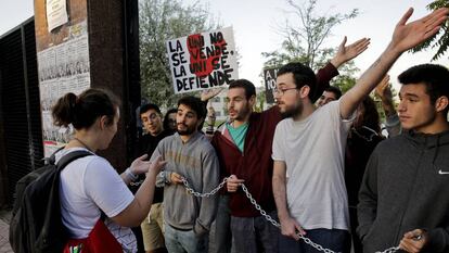 Daniel Aguilera y Eugenio Moreno cursan segundo de Administración de Empresas (ADE) en inglés. Hoy, como todos los días, han ido a clase “orgullosos de esta institución educativa, no hay un problema generalizado”. Estiman que en el aula faltaban la mitad de los alumnos españoles, pero ninguno de los Erasmus, que son mayoría. “Los de fuera no entienden lo que está pasando. Se está incordiando, los medios están describiendo un miedo y una ansiedad que no son reales”, señala indignado Daniel. Ingresaron en su carrera porque tenían más de un 7,4 de media y este año la nota de corte ha crecido dos décimas. “Hay mucha demanda, es la única universidad de Madrid que imparte todo en inglés”, explica Eugenio.