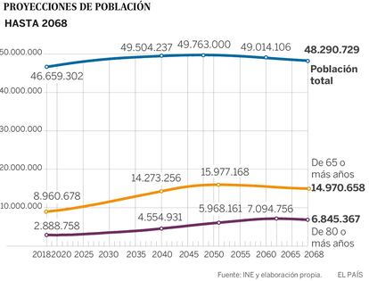 España envejece. En 2033, dentro de tres lustros, uno de cada cuatro españoles tendrá 65 años o más. Serán más de 12 millones de personas en esas edades frente a los alrededor de nueve que hay ahora. Dentro de 50, la cifra se elevará a cerca de 15 millones. Para entonces, en 2068, casi siete millones (6,85) de personas habrán cumplido o superado los 80, una cifra que duplica los casi tres millones actuales. Esta es la proyección de población y hogares que este miércoles publicó el Instituto Nacional de Estadística (INE). Según estos datos, el número de personas que viven solas aumentará hasta alcanzar los 5,8 millones en 15 años. Será un país más viejo y con más soledad.