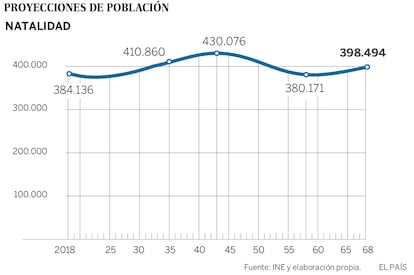 Al envejecimiento de la población se añade que, según las proyecciones, el número de nacimientos seguirá reduciéndose hasta 2022, continuando con la tendencia iniciada en 2009. A partir de 2023, sin embargo, los nacimientos comenzarán a aumentar debido a la llegada a las edades de mayor fecundidad de generaciones más numerosas, como las nacidas a partir de la segunda mitad de los noventa. Así pues, en 15 años la cifra anual de nacimientos habrá aumentado hasta 403.718, un 3,5% más que en la actualidad.
