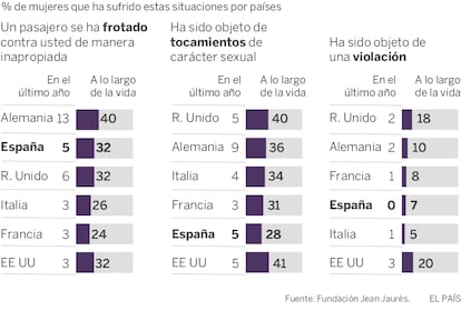 Las cifras españolas en materia de agresiones físicas o incluso violaciones son más parecidas a las de otros países o, en los casos más graves, incluso más bajas. Así, mientras la media europea de mujeres que dicen haber sufrido manoseos o tocamientos sexuales no consentidos (como tocar el trasero) es del 34%, en España son el 28% las que se quejan de este tipo de agresiones sexuales en el espacio público. Cuando se trata de una violación, la diferencia es aún mayor: 7% en España frente a 10% de media europea o 20% en EE UU.