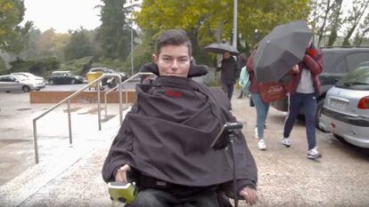 Un joven de 21 años, que solo mueve la mano y los pies por una enfermedad rara que le ha postrado en una silla de ruedas, se beneficia de un plan de accesibilidad de la Complutense