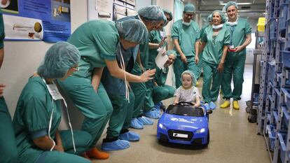 Noa entró a quirófano en un Audi azul descapotable. A primera hora de la mañana de este viernes, la pequeña, de cuatro años, tomó el volante del vehículo y, ataviada con un pijama estampado de dibujos de colores, echó a rodar hacia la sala de operaciones. Sobre el imponente deportivo de alta gama —teledirigido por un sanitario tres pasos más atrás—, Noa cruzó sonriente el pasillo que conducía al quirófano para ser operada de una hernia umbilical. Mientras, el equipo médico del centro quirúrgico ambulatorio del hospital Parc Taulí de Sabadell (Barcelona) arengaba a la conductora entre risas y palmas. Los sanitarios de esta unidad del Taulí han puesto en marcha este particular traslado a la mesa de operaciones para reducir el estrés y la ansiedad de los pacientes pediátricos en los procesos quirúrgicos.