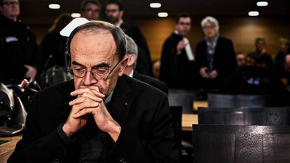 Es quizás la imagen que mejor representa lo que está en juego en el juicio iniciado ayer contra el cardenal Philippe Barbarin, arzobispo de Lyon, por ocultar los abusos contra menores de un cura bajo su mando, Bernard Preynat. El religioso más influyente de Francia, amigo de varios papas, llegó ayer al tribunal correccional sin hacer declaraciones y se sentó con la mirada en todo momento fija bien al frente o bien al suelo —en las más de seis horas de audiencia no se giró ni una sola vez hacia las víctimas que lo acusan de silencio, ni tuvo un solo gesto hacia ellas pese a estar a centímetros de distancia—, sin romper su mutismo salvo cuando fue llamado a responder a las preguntas de los jueces y los abogados. No se inmutó tampoco cuando, apenas un par de pasos atrás, otra de las centenares de víctimas violadas por un cura condenado por pederastia relataba a quien quisiera escucharle el martirio sufrido cuando fue violado a los 13 años. En su turno de palabra, el cardenal negó sin embargo fehacientemente haber buscado ocultar ese tipo de “hechos terribles”.