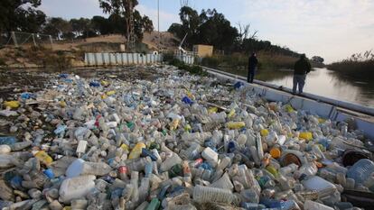 Miles de recipientes llegan desde las acequias hasta una barrera de contención situada en una zona protegida junto al litoral de Guardamar
