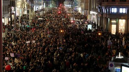 Las multitudinarias manifestaciones en España por el 8 de marzo se han celebrado a lo largo de este viernes en todo el país para reivindicar que se termine con la violencia de género, la brecha salarial o los techos de cristal en las empresas. Las protestas más masivas en las principales capitales para protestar por la desigualdad aún imperante entre hombres y mujeres han tenido lugar por la tarde. Por ejemplo, unas 350.000 personas han acudido a la protesta en Madrid, según la Delegación del Gobierno; en Barcelona han ido 200.000 manifestantes, según la Guardia Urbana; y en Sevilla y en Bilbao, 50.000, según fuentes policiales y municipales. La mayor parte del Gobierno de Pedro Sánchez, el más femenino de la historia de España, con 11 ministras de un total de 17, ha acudido a las manifestaciones. Esta es la primera vez que la mayor parte de un Ejecutivo asiste a las marchas del 8 de marzo. Así te hemos contado las movilizaciones: