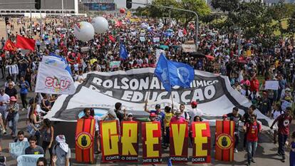 Miles de manifestantes se han echado a las calles de Brasil este miércoles en protesta por los recortes anunciados, o sugeridos, por el Gobierno de Jair Bolsonaro bajo lemas como “la educación no es gasto, es inversión”. Son la primera gran muestra de descontento popular contra el polémico presidente que lleva en el poder cuatro meses y medio. Bolsonaro, que está de visita en Estados Unidos, ha respondido insultando a los estudiantes. Les ha llamado “tontos útiles, unos imbéciles, que están siendo utilizados por un minoría que compone el núcleo de las universidades federales de Brasil”, ha declarado en Dallas cuando le han preguntado por las movilizaciones, informa Folha.