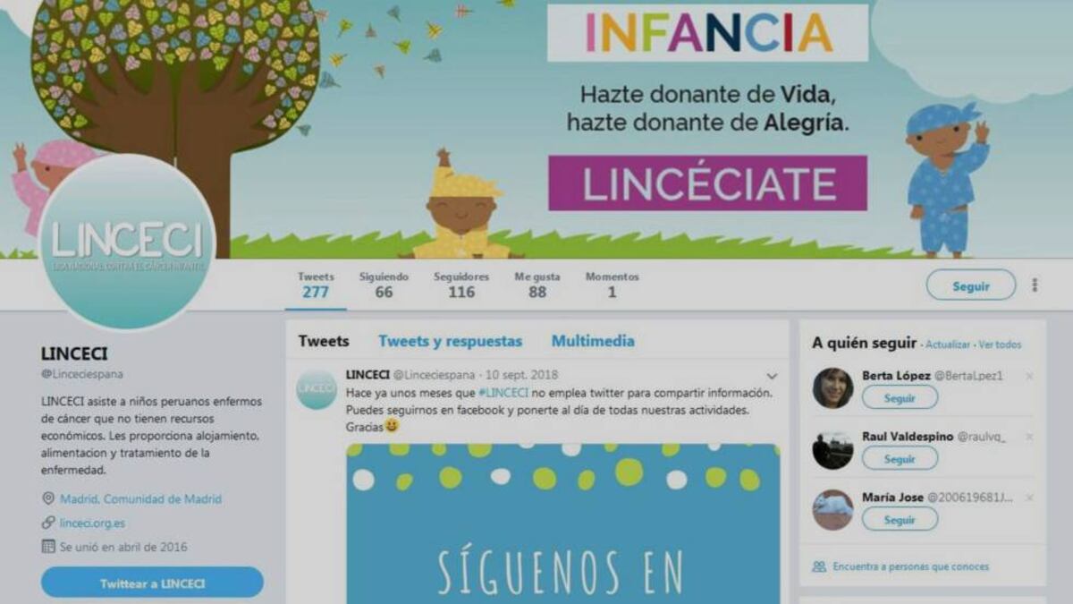 En la red, la organización tenía el domicilio en Madrid, en la oficina número seis del quinto piso de la calle Gran Vía, 40. Tanto su página web oficial como su perfil de Facebook han sido desactivados. Tan solo su cuenta de Twitter, abierta en abril de 2016, permanece activa con un último post de septiembre de 2018 en el que avisaban de que hacía meses que no usaban ese canal "para compartir información". "Puedes seguirnos en facebook y ponerte al día de todas nuestras actividades. Gracias", terminaba el tuit. En la biografía de esta red social, la falsa organización se definía así: "LINCECI asiste a niños peruanos enfermos de cáncer que no tienen recursos económicos. Les proporciona alojamiento, alimentación y tratamiento de la enfermedad".