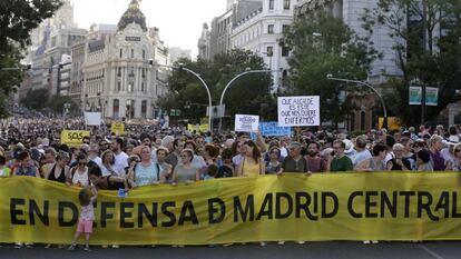 Miles de personas han ignorado este sábado el calor insoportable que azotaba la capital y han salido a la calle en defensa de Madrid Central, el plan anticontaminación que restringe la entrada de los vehículos más contaminantes al corazón la ciudad. Este plan fue puesto en marcha por el anterior equipo de gobierno municipal, encabezado por Manuela Carmena y, tras recuperar el PP la alcaldía con la ayuda de Ciudadanos y Vox, el Ayuntamiento ha decretado una moratoria que suprime las multas por incumplir las restricciones durante tres meses. Esto supone en la práctica su eliminación.