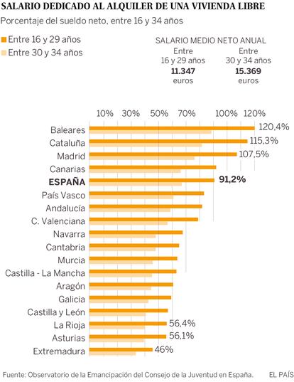 Considerando el sueldo medio de este grupo de edad (unos 940 euros al mes), en el informe se estima que para afrontar el coste de una vivienda en solitario, incluyendo el alquiler y los gastos, los jóvenes que quieran mudarse a vivir solos deberían aportar el 91,2% de su sueldo. Hace 10 años, el porcentaje era del 57,4%. Lo equilibrado es el 30%.