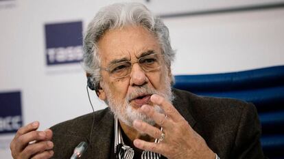 La primera conferencia de prensa de Plácido Domingo tras los escándalos de presuntos acosos sexuales terminó sin un solo comentario sobre la polémica. Ni la más mínima alusión en la comparecencia que ha hecho este martes en Moscú, donde actuará el próximo jueves. Y, como en los viejos tiempos soviéticos, a la prensa española no se le dio la palabra. Las pocas preguntas hechas a Domingo fueron sobre su madre, su esposa, fútbol y, naturalmente, música.