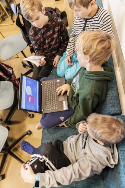 Valentín de 10 años, hijo de ecuatoriana y finlandés, enseña en su portátil cómo cuando empezó la unidad sobre la historia de Egipto expresó por escrito a su profesor que quería hacer un trabajo coral, consultando en páginas web y editando un vídeo con las conclusiones. El maestro le guió en su aprendizaje con preguntas y sus padres hicieron un seguimiento de su progreso semanal interpelando al docente cuando consideraron pertinente. Su colegio espera de él que se autorregule el aprendizaje y se autoevalúe. Pero los expertos no se cansan de remarcar que no desprecian los medios tradicionales. “Cuando empezamos un proyecto no consultan Internet, sino libros en papel”, resalta la subdirectora del Roihuvuori.