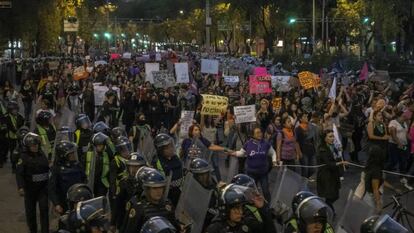 Una marcha que pedía paz ha comenzado a golpes desde el inicio. De poco sirvió el llamado “cinturón de paz” del Gobierno local compuesto con cientos de funcionarias de organismos públicos vestidas de blanco. Las trabajadoras de la Administración de Claudia Sheinbaum servían de muro de contención entre la protesta y las policías, todas ellas mujeres. Pero las manifestantes arrasaron con todo a su paso: marquesinas, portales, cohetes, pinturas en las fachadas y pequeños incendios en las vallas que protegían el resto de monumentos de la calle emblemática de la ciudad.