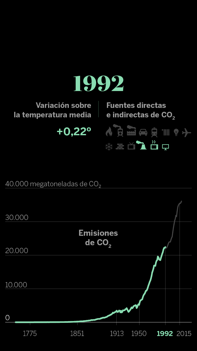En 1992 se aprueba la Convención Marco de Naciones Unidas sobre el Cambio Climático, un texto en el que ya se reconoce la existencia de un calentamiento alimentado por la actividad del ser humano. Y se fija el objetivo de mitigar esas emisiones, que no paran de crecer.