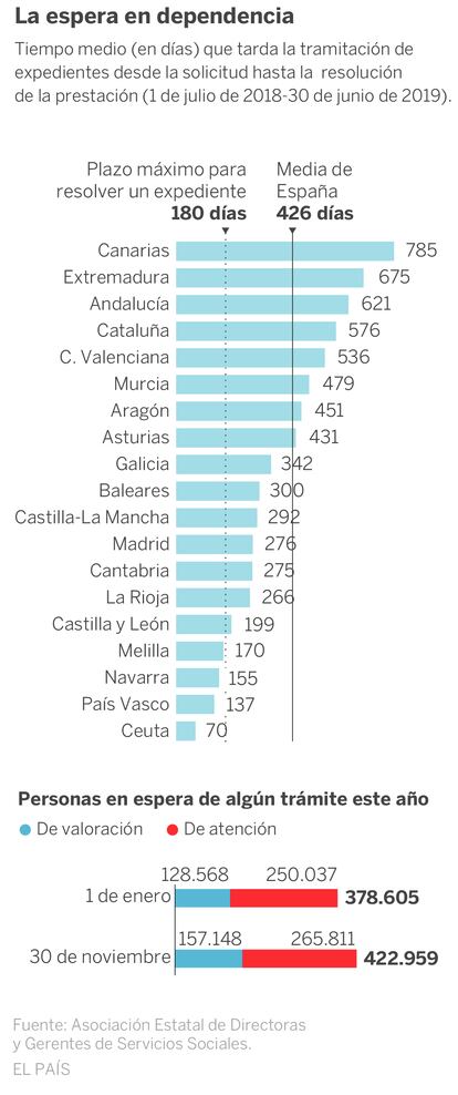 Son 426 días de espera. Este es el tiempo medio que debe aguardar en España una persona en situación de dependencia mientras se tramita su expediente. Lo que transcurre desde que presenta la solicitud y recibe la prestación o servicio, según el borrador de la nueva estadística del Imserso. Hasta ahora, el dato se desconocía. En el documento, presentado a las comunidades autónomas el pasado octubre, se establece el plazo correspondiente a cada territorio, pero de manera anónima. Un análisis de la Asociación de Directoras y Gerentes de Servicios Sociales, experta en el sector, revela a quién corresponde cada cifra. La normativa establece que el plazo máximo que las comunidades tienen para resolver los casos es de 180 días. Pocas cumplen. En Canarias, la peor parada, alcanza 785 días, más de dos años. En País Vasco y Navarra, 137 y 155, respectivamente.