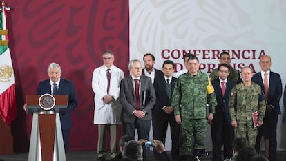 El presidente de México, Andrés Manuel López Obrador, se ha rodeado hoy en su conferencia de prensa diaria de la plana mayor de su gabinete para escenificar que el país entra ya en las fases complicadas de la epidemia del coronavirus. Los militares han hecho públicos sus planes sanitarios -sin profundizar apenas en los detalles de en qué consistirán-, que recibirán un aporte extra de 4.500 millones de pesos (unos 180 millones de dólares). Hacienda ha anunciado, además, que adelantará a los Estados la transferencia de 10.500 millones, correspondientes a abril y mayo, y al Instituto de Salud para el Bienestar llegarán otros 4.500. López Obrador, ahora sí, ha anunciado que “en su momento se otorgarán créditos sin intereses o muy bajos a un millón de pequeños negocios que, desgraciadamente, van a resultar afectados por la crisis”.