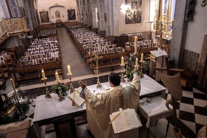 Desde que se decretó el confinamiento, la mayoría de las diócesis decidieron cerrar los templos para prevenir las aglomeraciones y, con ellos, los contagios. No obstante, los sacerdotes continuaron, como de costumbre, celebrando misa. Muchos decidieron retransmitirlas por las redes sociales o a través de una emisora local. Para los que no disponían de esos recursos, oficiar misa, cuentan, se ha convertido en una sensación extraña. “Estoy solo y mi voz retumba en la iglesia. Como no hay nadie que responda a las oraciones, la celebración diaria puede durar 15 minutos”, explica un sacerdote anónimo de Murcia.