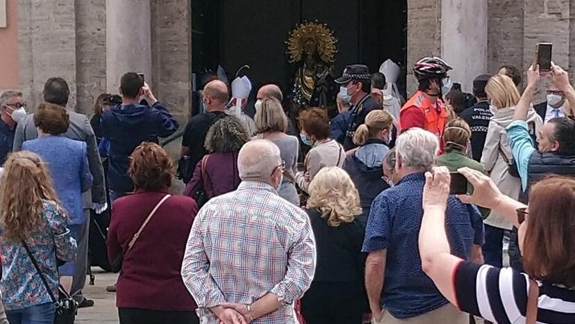 En circunstancias normales la festividad de la Geperudeta (Jorobadita) habría reunido este segundo domingo de mayo a miles de devotos en la plaza de la Virgen, y la celebración habría alcanzado su clímax con el traslado de la imagen desde la basílica a la vecina catedral, con cientos de brazos estirándose para intentar tocarla. En previsión de que pudiera producirse una congregación de personas, tres patrullas de la policía local vigilaban las inmediaciones del templo, pero la apertura de las puertas les ha pillado por sorpresa y en número insuficiente para controlar la situación y se han limitado a pedir a los fieles que permanecían en el exterior y se dirigían hacia la entrada de la basílica que guardaran las distancias de seguridad.