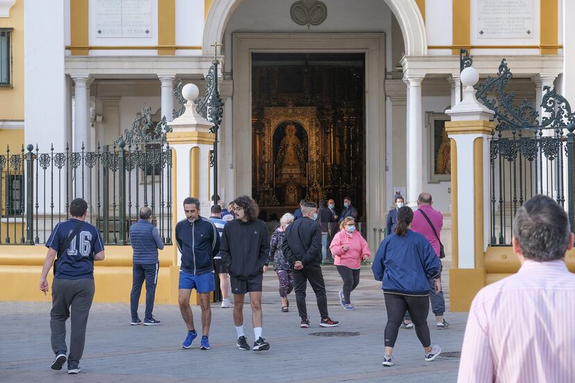 No hay turistas en Sevilla, pero esta mañana el trajín en torno a la basílica de La Macarena —el tercer monumento más visitado de la capital andaluza, tras la Catedral y el Alcázar—, era más intenso que el de cualquier lunes normal en esta ciudad. Este tampoco es un lunes habitual, pero en el arranque de la fase 1 de la desescalada, la recuperación de los cultos ha dado sosiego a muchos fieles para los que a la imposibilidad de visitar las imágenes se había sumado el desaliento de no verlas en la calle por la suspensión de la Semana Santa. En una mañana desapacible, los sevillanos han optado por refugiarse en los templos, antes que aventurarse a sentarse en una terraza.