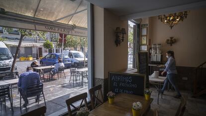 “Ayer dimos el último arreón para prepararlo todo, a ver qué pasa”, dice Juan, el responsable de Los Hermanos Gómez, en la Ronda de Capuchinos, en Sevilla. Parapetado tras una máscara de plástico que recuerda a un soldador, sirve a dos clientas habituales a primera hora en una terraza con solo cuatro mesas, menos de la mitad de las que tenía dispuestas antes del confinamiento (la reducción obligatoria es del 50%). La ciudad más grande de España que entra en fase 1 se prepara con escenas antes tan cotidianas como la carga y descarga de barriles de cerveza. Sin embargo, el cielo plagado de nubes, que han provocado lluvia pasadas las diez de la mañana, ha disuadido a muchos sevillanos de estrenar las terrazas. “Vamos a ver si a mediodía, cuando escampe, esto se anima”, cuenta Paco que regenta un bar familiar en el barrio de La Macarena.