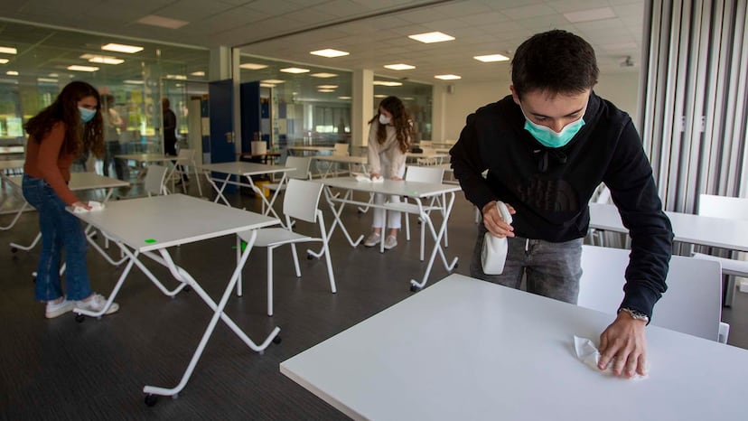 Los servicios de limpieza habían dejado todo listo y desinfectado para que alumnos y profesores se reencontraran en clase. “Nuestro trabajo está siendo más laborioso y minucioso, porque tenemos que limpiar todo lo que se toca, manillas, pomos, teclados, ratones… Pasamos mucho más tiempo”, señala Cristina, limpiadora del Politécnico Easo. Aitor Arriaga cursa el grado medio de Técnico en Emergencias Sanitarias y acudía al centro “muy concienciado” de las medidas de seguridad que debía tomar dentro del instituto: “Nada de arrimarnos y lavado continuo de manos porque en las prácticas de reanimación cardiovascular (RCP) tenemos que manipular un muñeco para aprender la técnica”.