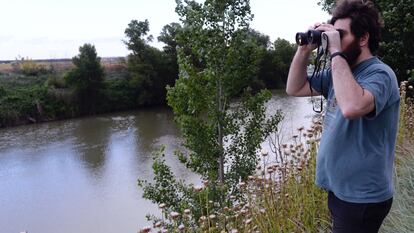 Un joven busca con sus prismáticos el cocodrilo de metro y medio avistado este sábado en Simancas (Valladolid).Vídeo: Nacho Gallego / EFE | ATLAS