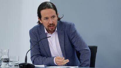 El vicepresidente tercero del Gobierno, Pablo Iglesias, durante la rueda de prensa posterior a la reunión del Consejo de Ministros celebrada este martes en el complejo de La Moncloa. En vídeo, Iglesias presenta el anteproyecto de ley para proteger a la infancia y a la adolescencia "frente a todo tipo de violencia".Vídeo: EFE