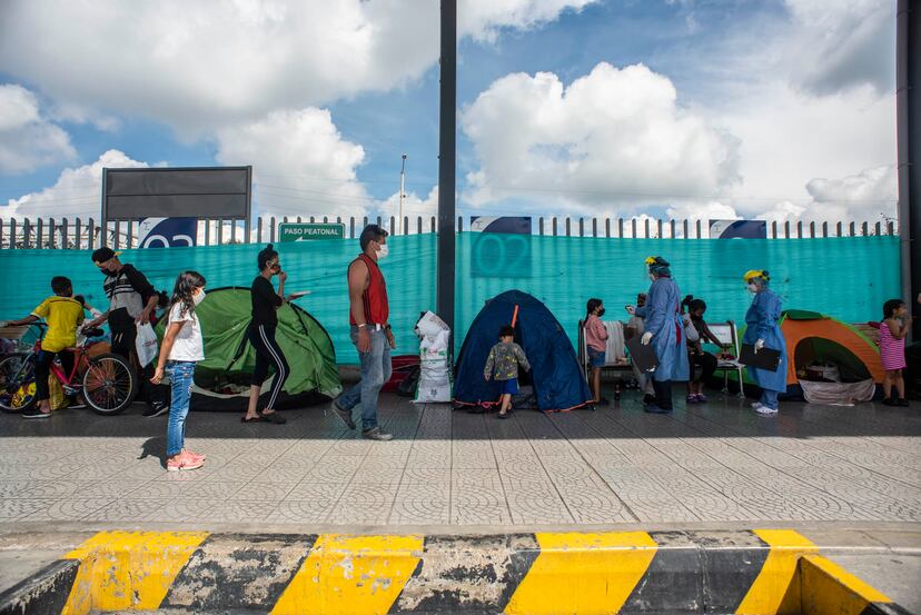 Basta atravesar la autopista para toparse con un grupo de niños que juegan beisbol con una pesada rama por bate. Sin trabajo y sin hogar en medio de la pandemia, las familias de migrantes improvisaron un campamento con bolsas de plástico y sábanas sobre el separador de vías, un enclave boscoso enmarcado por dos riachuelos. A mediados de la semana albergaba a más de 500 personas, entre ellas 66 niños menores de 5 años y 17 mujeres embarazadas. La alcaldía de Bogotá ha dispuesto para ellos más de 500 pruebas de coronavirus, les ha entregado elementos de aseo y ha ofrecido trasladarlos a albergues, pero están empecinados en subirse en autobuses que los lleven hasta la frontera. Una opción incierta en medio de las restricciones en vigor.