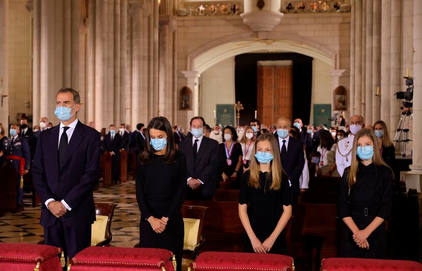 Además de la Familia Real al completo (el Rey, la Reina, la Princesa de Asturias y la infanta Sofía, todos de riguroso luto), han asistido la vicepresidenta primera Carmen Calvo; las presidentas del Congreso y el Senado, Meritxell Batet y Pilar Llop; los presidentes del Tribunal Constitucional y el Supremo, Juan José González Rivas y Carlos Lesmes; el presidente del PP, Pablo Casado; la presidenta de la Comunidad de Madrid, Isabel Díaz Ayuso; el alcalde de la capital, José Luis Martínez-Almeida; y el jefe de la cúpula militar, Miguel Ángel Villarroya, entre otras autoridades, además de familiares de los fallecidos y representantes de ONG como Cáritas. Todos los asistentes llevaban mascarilla y se han dejado huecos en los bancos para garantizar la distancia social, además de tomar medidas profilácticas, como entregar en mano la hostia consagrada al comulgante.