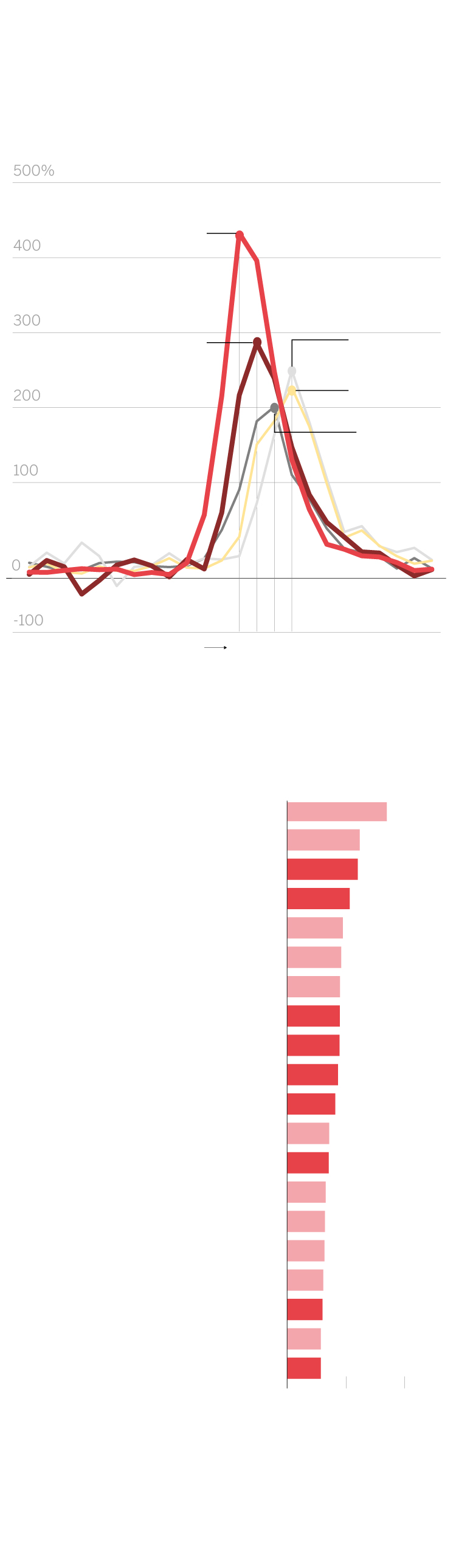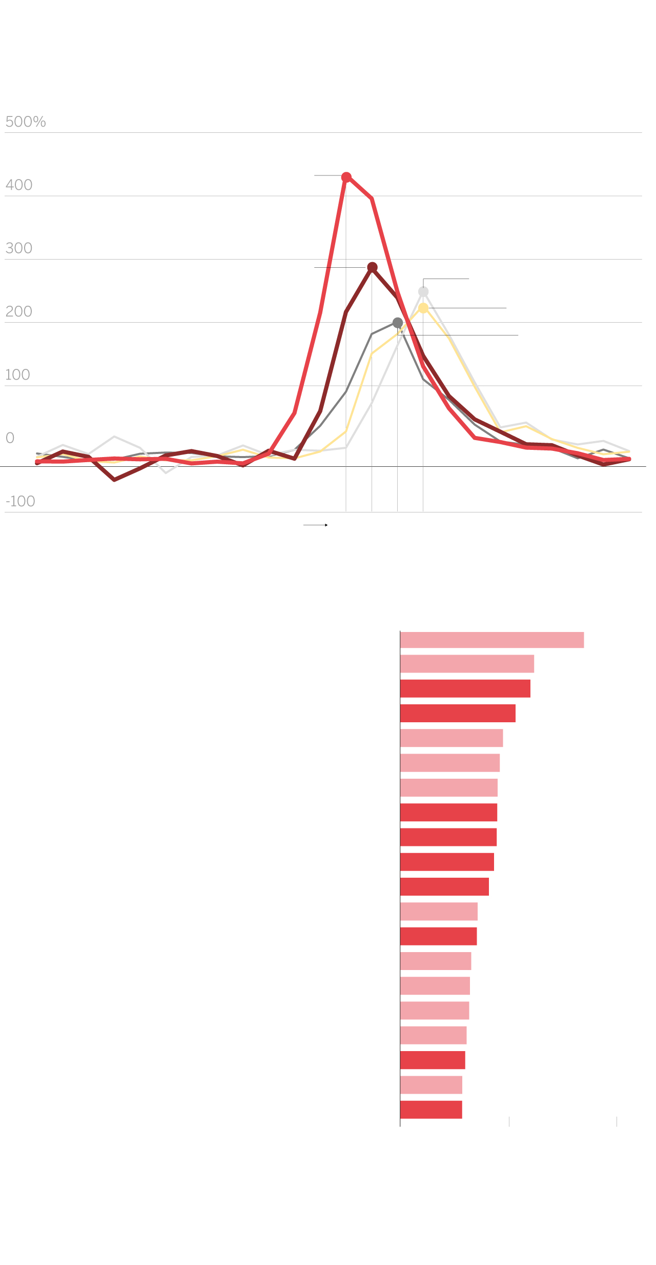 Tras estas dos regiones italianas, las provincias españolas donde se registró mayor sobremortalidad fueron Segovia y Ciudad Real. Si el pico de muertes en las regiones italianas se produjo en la semana del 20 de marzo, en España se retrasó unos días, hasta la siguiente semana, la del 27 de marzo. España tiene nueve provincias en la lista de las 20 regiones que registraron la mayor mortalidad en el pico de la epidemia.