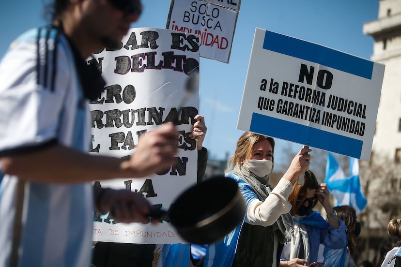Sus palabras recibieron críticas de los detractores al Gobierno, que habían convocado a una nueva movilización de protesta frente al Congreso tras la multitudinaria del pasado 17 de agosto. Decenas de personas desplegaron una enorme bandera argentina en un abrazo simbólico al edificio legislativo, mientras cientos más gritaban consignas contra el Ejecutivo peronista y la vicepresidenta, Cristina Fernández de Kirchner. La concentración coincidió con el inicio de la sesión en la Cámara alta en la que tiene previsto aprobarse la reforma judicial. La oposición sostiene que la iniciativa es una maniobra para asegurar la impunidad Fernández de Kirchner en sus juicios por corrupción.