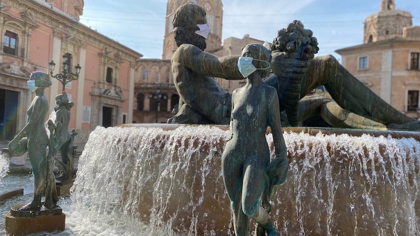 Una treintena de estatuas de València han aparecido esta martes con una mascarilla higiénica sobre nariz y boca. La Policía Local de la ciudad ha ido colocando a lo largo de la noche, en colaboración con los Bomberos y la Concejalía de Cultura, mascarillas a las estatuas de la céntrica Fuente de Neptuno, a otra dedicada al torero Manolo Montoliu o la erigida en recuerdo del pintor José Ribera, conocido como El Españoleto. El objetivo de esta sorprendente campaña es concienciar a los ciudadanos del uso de las medidas de protección contra el coronavirus.