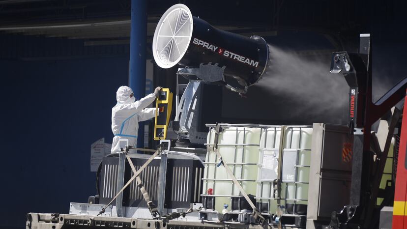 Un primer grupo de reconocimiento, dotado con cinco militares, tres vehículos ligeros y uno pesado, se encuentra ya en Mercamadrid y otro, con 25 militares, tres vehículos ligeros y tres pesados, está en camino, según ha informado el Ministerio de Defensa. El objetivo es realizar durante las próximas horas “labores intensas y minuciosas en cerca de 200.000 metros cuadrados”, con la ayuda de un cañón nebulizador de cloruro sódico especialmente diseñado para desinfectar grandes superficies.