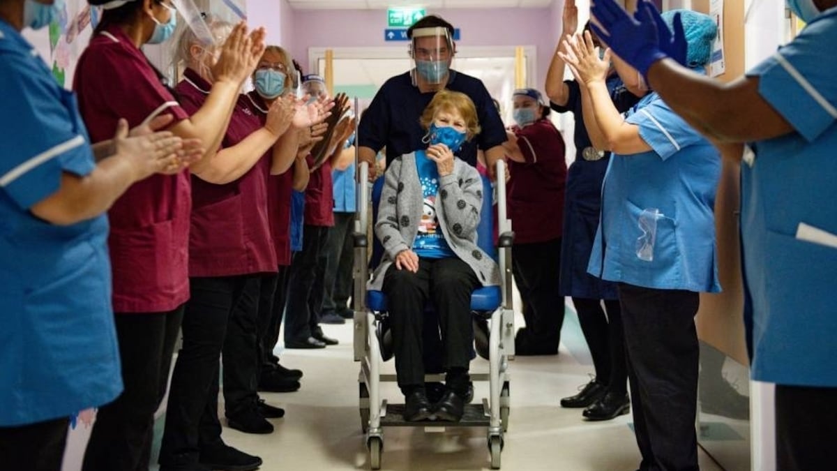 Kay Gallwey es pintora y tiene 84 años, y este martes se lamentaba de no tener consigo más de un par de tarjetas personales para poder repartirlas entre el puñado de periodistas empeñados en convertirla en una pequeña estrella. Había sido citada apenas 24 horas antes por el Servicio Nacional de Salud (NHS, en sus siglas en inglés) de Inglaterra para su primera dosis de la vacuna contra la covid-19 desarrollada por Pfizer y BioNTech.