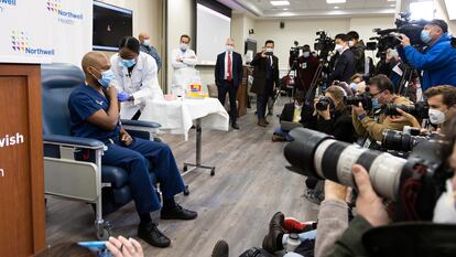 Once meses después de documentarse el primer contagio de coronavirus en EE UU, y cuando la enfermedad ha dejado más de 35.000 muertos en el Estado de Nueva York, una enfermera de un hospital de la ciudad, el Long Island Jewish Medical Center, ha recibido en la mañana de este lunes la primera vacuna contra la covid-19 que se administra en el país más afectado del mundo por la pandemia, con más de 16 millones de casos y 300.267 muertes por coronavirus. El gobernador del Estado, el demócrata Andrew Cuomo, estableció contacto por videoconferencia con la sala del hospital y difundió el momento en su cuenta de Twitter, oficiando como presentador. “La primera neoyorquina, la enfermera de intensivos Sandra Lindsay, ha sido vacunada. Estamos más cerca de la curación. Gracias, Sandra”, ha escrito el gobernador en un tuit encabezado por la palabra HISTORIA, en mayúsculas.