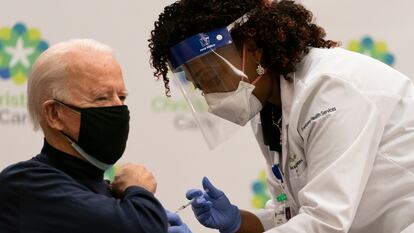 Joe Biden, el presidente electo de Estados Unidos, fue inyectado este lunes frente a las cámaras de televisión con la vacuna contra la covid-19 en un esfuerzo, como futuro líder del país, de dar visibilidad a la inoculación para que los estadounidenses sientan confianza y estén preparados para recibirla en cuanto esté disponible para la población. La inyección de la vacuna Pfizer/BioNTech, el primero de los dos inmunizantes ya autorizados en Estados Unidos, le fue aplicada en un hospital de Newark, cerca de Wilmington, ciudad del Estado de Delaware donde todavía reside el demócrata hasta que se mude a la Casa Blanca el próximo 20 de enero. Estados Unidos suma ya más de 318.000 muertes y más de 17 millones de contagios por la covid-19.