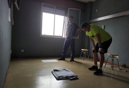 A media mañana y como por arte de magia una de las habitaciones vacías se ha transformado en un gimnasio, algo que muchos de los internos echaban de menos. Han obrado el milagro un par de sillas, unas mantas en el suelo y un programa de crossfit adaptado por la hermana de uno de ellos. De los altavoces sale música mientras se ejercitan en turnos de a dos, dado el reducido tamaño de la habitación. Les pregunto a los deportistas si les importa que les saque una foto. “Qué más da, si ya casi somos como de la familia”, responden.