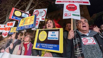 El Gobierno de Murcia ya reafirmó este lunes que no iba a echarse atrás en su decisión del veto parental, aunque el 29 de enero rebajó la medida y anunció que solo lo aplicará si los padres lo piden expresamente. Y Murcia no tiene visos de querer ir muy lejos en esta guerra con el Ejecutivo. “La autorización familiar para actividades complementarias [...] no la vamos a retirar salvo que una instancia judicial nos lo pida”, afirmó este lunes el consejero de Presidencia y Hacienda, Javier Celdrán. Es decir, Murcia deja la puerta abierta a cerrar la polémica si le fuerza el TSJM. Acatará la resolución judicial con la “tranquilidad” de que “las cosas se han hecho bien”, según Celdrán.