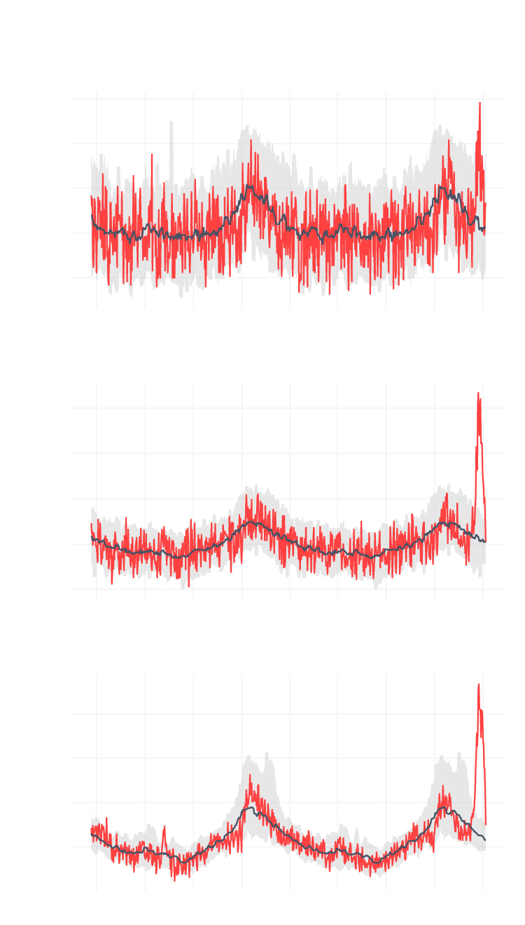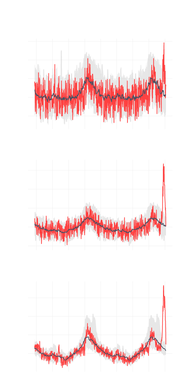 El gráfico muestra las muertes esperadas y observadas desde 2018, que el centro ha hecho públicas por primera vez este martes en una nueva herramienta. La línea negra representa los fallecimientos esperados, según el modelo estadístico de MoMo, para todas las causas. La línea roja muestra la muertes realmente observadas y notificadas por los registros civiles. En los últimos dos años no se había registrado ni un solo día con 1.600 muertes, pero desde marzo esa cifra se ha superado al menos 15 veces.