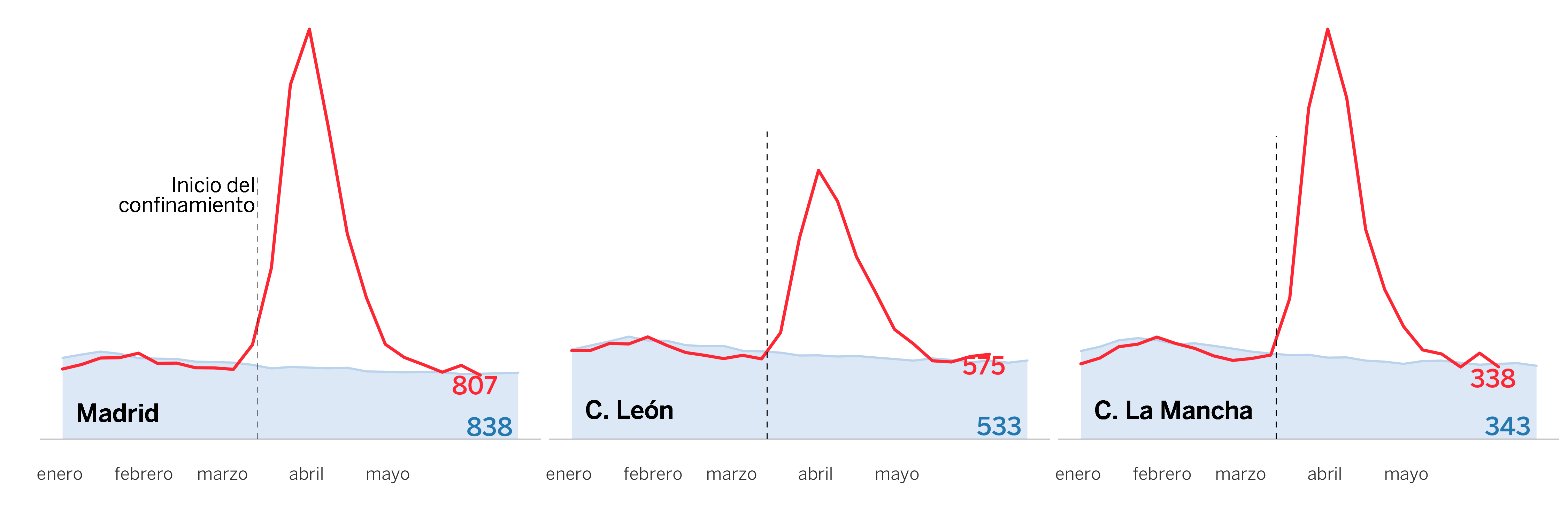 El exceso de muertes se calcula a partir de modelo un matemático que calcula las muertes esperadas, es decir, las que deberían producirse en condiciones normales. Suele repuntar durante las olas de calor de verano o con fuertes epidemias de gripe. En esta crisis el exceso acabará por superar todos esos sucesos. Algunos registros civiles no están informatizados lo que infraestima las muertes en estos lugares, así que hemos ajustado sus cifras usando datos del INE como explicamos en la metodología.
