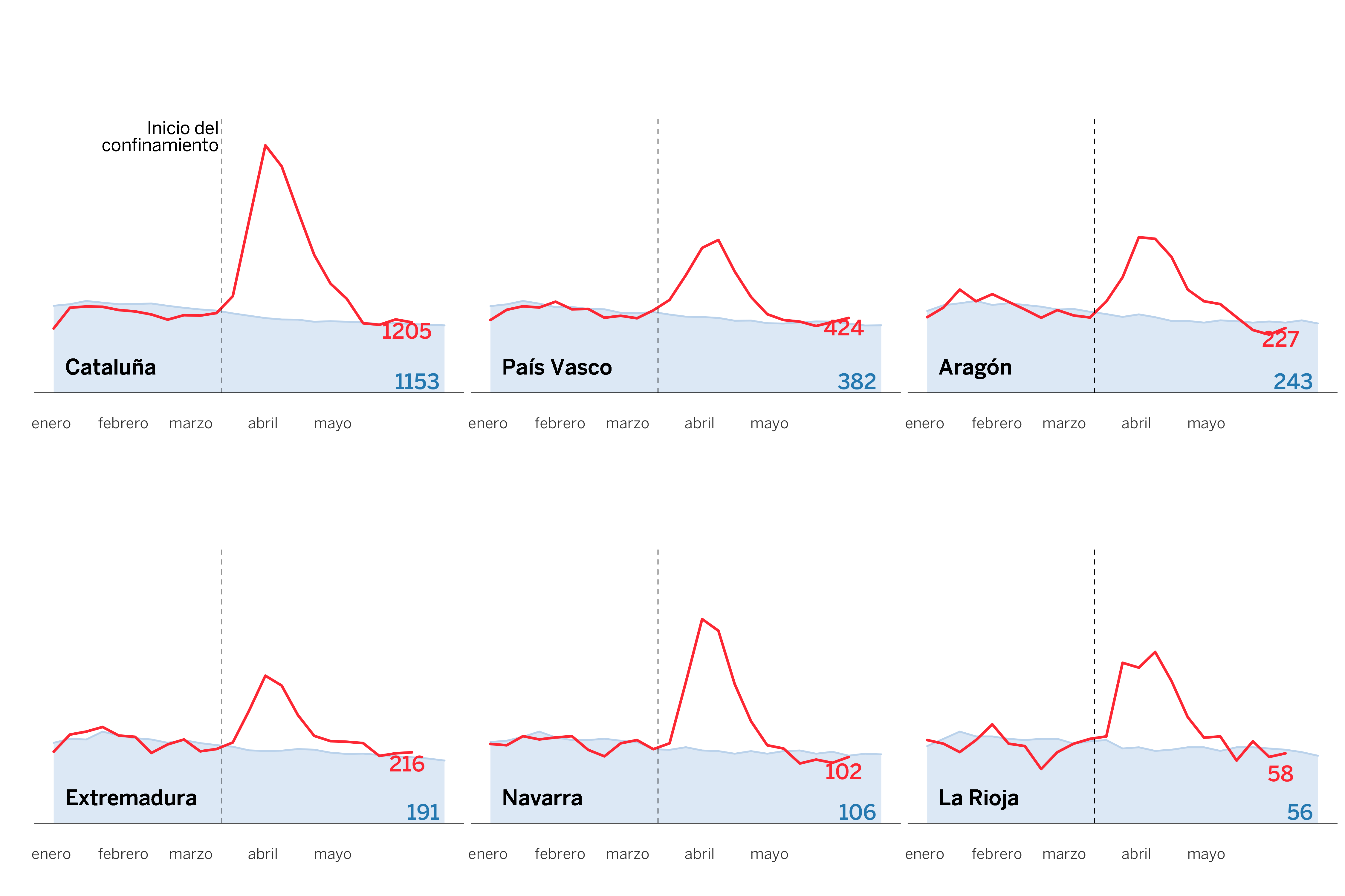 Otras comunidades autónomas donde el virus brotó primero han podido controlar con menor daño la pandemia. En La Rioja, donde se encontró uno de los primeros brotes entre los asistentes a un funeral, se observa un exceso de muerte del 48% en las últimas semanas. En Navarra sufrieron un repunte en los fallecimientos hace una semana y registran un exceso del 56%. En País Vasco el número absoluto de muertes ha sido mayor, pero también lo era el de muertes esperadas y su exceso ha rondado el 40%.