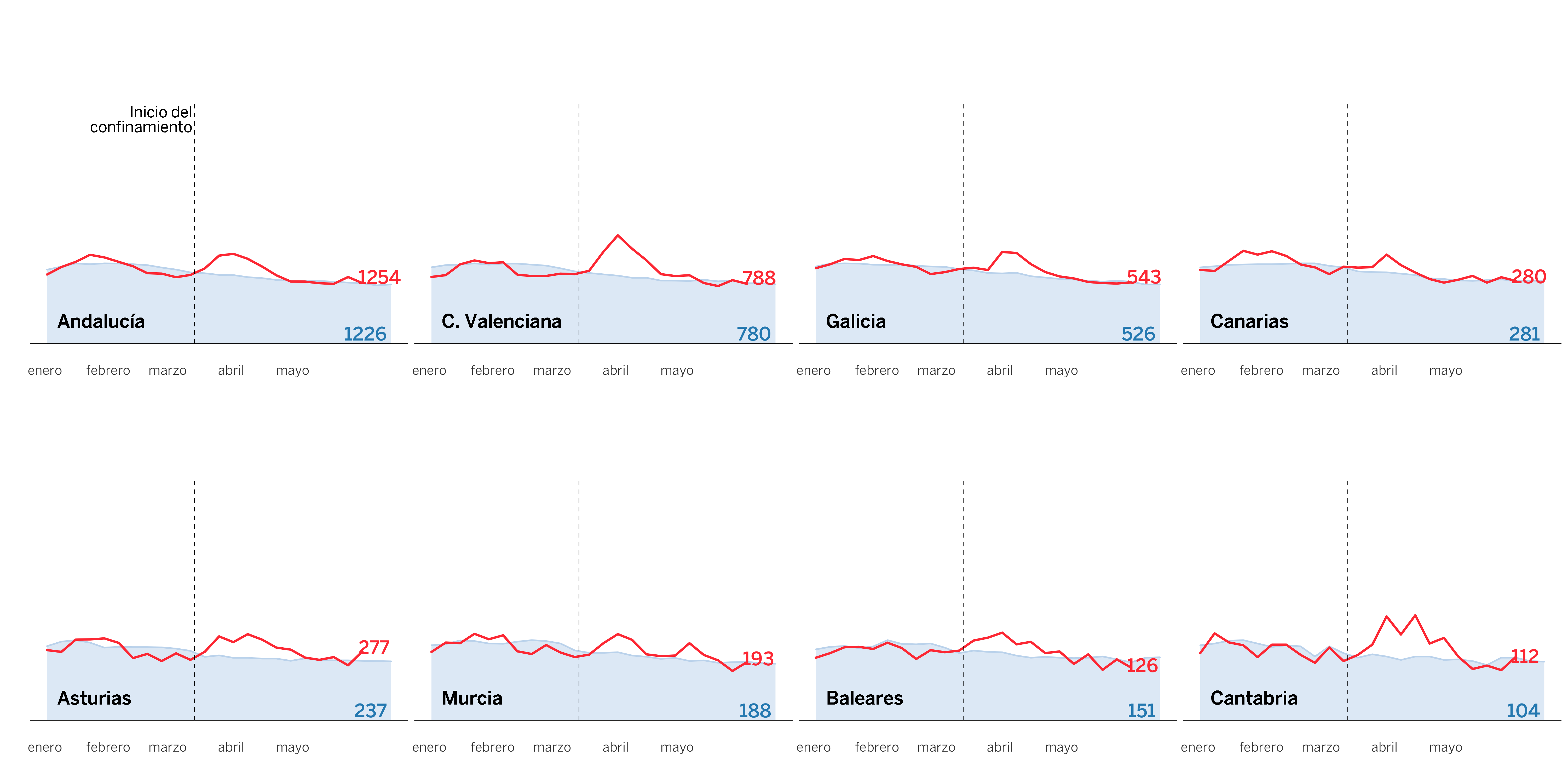 Entre las regiones menos golpeadas por el virus destacan Canarias, Murcia, Galicia o Andalucía donde su exceso no llega al 15%. Comunidad Valenciana, con 1.197 muertes registradas hasta el 10 de abril, rondaba entonces el 20% de exceso.