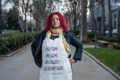 Rafaela le ha dado un giro al delantal. No se lo pone para trabajar sino para reivindicar derechos. Es empleada del hogar, como su hermana y sus primas. Y activista. Llegó a España en 1992. Con la pandemia, cuenta, se ha recrudecido la situación de su colectivo, formado en un 98% por mujeres. “Nuestro trabajo sostiene la vida. Nosotras cuidamos para que mucha gente pueda salir a trabajar fuera”. Pimentel, nacida en República Dominicana hace 60 años, denuncia la situación de compañeras internas que trabajan por 500 euros al mes “sin Seguridad Social, derechos, descanso ni vacaciones”. “Muchas se quedaron trabajando confinadas en los hogares, con personas mayores, con niños. Más de cuatro meses sin poder salir ni estar con sus familias, con estrés y soledad. Y el pago que le han hecho han sido despidos”, cuenta indignada. “Compañeras a las que las tiran a la calle de noche. Han trabajado dos o tres años y al final las echan. Lo vemos a diario”.