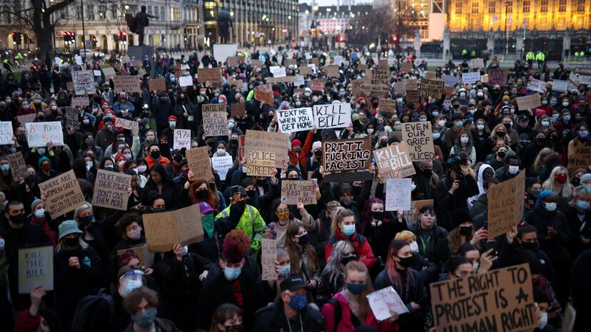 Un intenso humo de color morado se ha extendido este martes por Parliament Square, en Londres, mientras los diputados debatían en la Cámara de los Comunes una nueva Ley de Seguridad que, entre otras cosas, pretende dar a la policía más poderes para restringir las manifestaciones callejeras. Cada tarde, desde que el pasado sábado un grupo de agentes cargó contra algunas de las mujeres que asistían a la vigilia en honor de Sarah E...